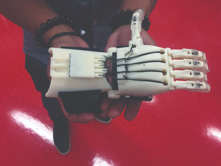 Anatomical hand designed and 3D printed by QCC mechanical engineering student Kevin Hernandes.